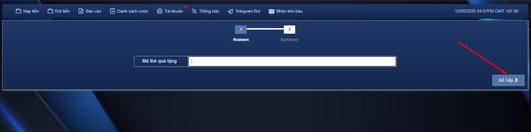 Bước 2: Nhập code nhận thưởng.